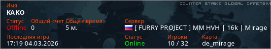 Играет на Counter Strike Global Offensive сервере. Страна: РоссияПервый раз замечен 16:59 04.03.2026