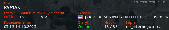 Играет на Counter Strike 1.6 сервере. Страна: СШАПервый раз замечен 05:11 14.10.2025
