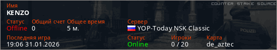 Играет на Counter Strike Source сервере. Страна: РоссияПервый раз замечен 19:04 31.01.2026