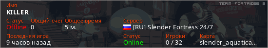 Играет на Team Fortress 2 сервере. Страна: РоссияПервый раз замечен 20:13 17.04.2026