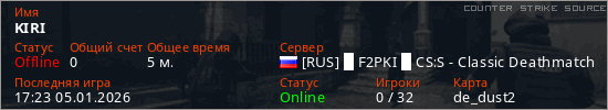 Играет на Counter Strike Source сервере. Страна: РоссияПервый раз замечен 17:21 05.01.2026