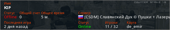 Играет на Counter Strike 1.6 сервере. Страна: РоссияПервый раз замечен 12:38 13.02.2026