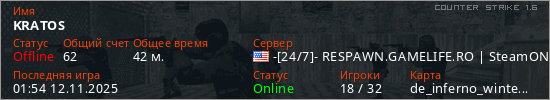 Играет на Counter Strike 1.6 сервере. Страна: СШАПервый раз замечен 21:34 28.01.2025