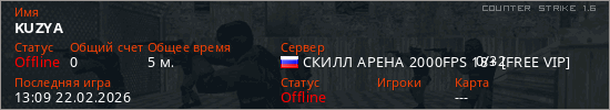 Играет на Counter Strike 1.6 сервере. Страна: РоссияПервый раз замечен 13:01 22.02.2026
