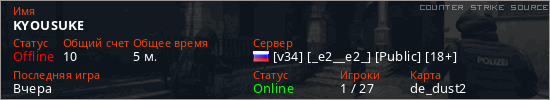 Играет на Counter Strike Source сервере. Страна: РоссияПервый раз замечен 17:58 24.12.2025