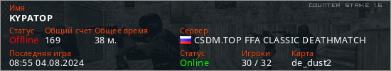 Играет на Counter Strike 1.6 сервере. Страна: РоссияПервый раз замечен 10:37 07.10.2023