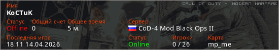 Играет на Call of Duty 4: Modern Warfare сервере. Страна: РоссияПервый раз замечен 16:35 14.04.2026