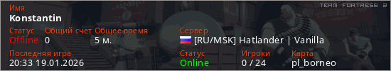 Играет на Team Fortress 2 сервере. Страна: РоссияПервый раз замечен 20:14 19.01.2026