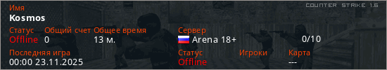 Играет на Counter Strike 1.6 сервере. Страна: РоссияПервый раз замечен 20:22 22.11.2025