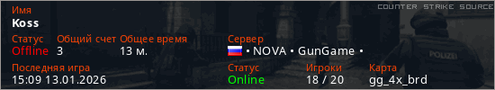 Играет на Counter Strike Source сервере. Страна: РоссияПервый раз замечен 18:56 10.01.2026