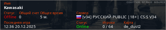 Играет на Counter Strike Source сервере. Страна: РоссияПервый раз замечен 12:29 20.12.2025