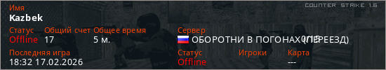 Играет на Counter Strike 1.6 сервере. Страна: РоссияПервый раз замечен 18:30 17.02.2026