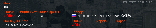 Играет на Counter Strike 1.6 сервере. Страна: РоссияПервый раз замечен 17:55 27.11.2025