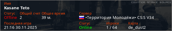 Играет на Counter Strike Source сервере. Страна: РоссияПервый раз замечен 19:38 10.11.2025