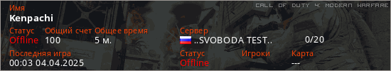 Играет на Call of Duty 4: Modern Warfare сервере. Страна: РоссияПервый раз замечен 23:46 03.04.2025