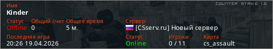 Играет на Counter Strike 1.6 сервере. Страна: РоссияПервый раз замечен 19:38 19.04.2026