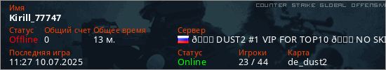 Играет на Counter Strike Global Offensive сервере. Страна: РоссияПервый раз замечен 14:33 07.03.2025