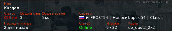 Играет на Counter Strike 1.6 сервере. Страна: РоссияПервый раз замечен 08:32 26.04.2026