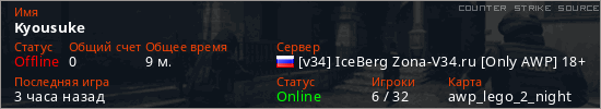 Играет на Counter Strike Source сервере. Страна: РоссияПервый раз замечен 11:01 06.02.2026