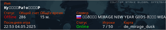 Играет на Counter Strike Global Offensive сервере. Страна: РоссияПервый раз замечен 00:57 28.04.2025