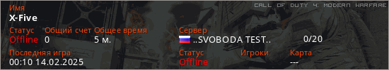 Играет на Call of Duty 4: Modern Warfare сервере. Страна: РоссияПервый раз замечен 23:04 13.02.2025
