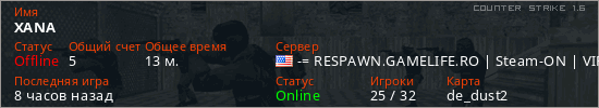 Играет на Counter Strike 1.6 сервере. Страна: СШАПервый раз замечен 01:26 20.09.2025