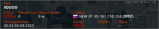Играет на Counter Strike 1.6 сервере. Страна: РоссияПервый раз замечен 19:19 05.09.2025