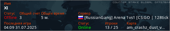 Играет на Counter Strike Global Offensive сервере. Страна: РоссияПервый раз замечен 03:09 31.07.2025