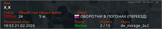 Играет на Counter Strike 1.6 сервере. Страна: РоссияПервый раз замечен 19:51 21.02.2026