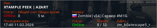 Играет на Counter Strike Source сервере. Страна: РоссияПервый раз замечен 17:34 11.02.2026
