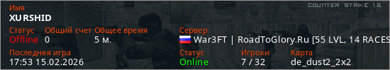 Играет на Counter Strike 1.6 сервере. Страна: РоссияПервый раз замечен 17:44 15.02.2026