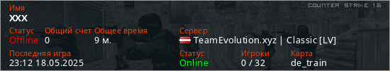 Играет на Counter Strike 1.6 сервере. Страна: ЛатвияПервый раз замечен 08:07 17.05.2025