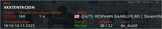 Играет на Counter Strike 1.6 сервере. Страна: СШАПервый раз замечен 19:31 09.02.2025