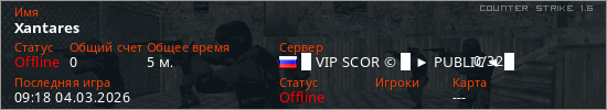 Играет на Counter Strike 1.6 сервере. Страна: РоссияПервый раз замечен 09:16 04.03.2026