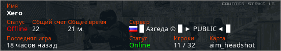 Играет на Counter Strike 1.6 сервере. Страна: РоссияПервый раз замечен 10:52 20.03.2026