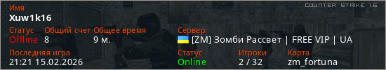 Играет на Counter Strike 1.6 сервере. Страна: УкраинаПервый раз замечен 19:05 15.02.2026