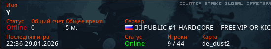Играет на Counter Strike Global Offensive сервере. Страна: РоссияПервый раз замечен 22:34 29.01.2026