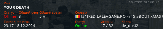 Играет на Counter Strike 1.6 сервере. Страна: РумынияПервый раз замечен 23:13 18.12.2024