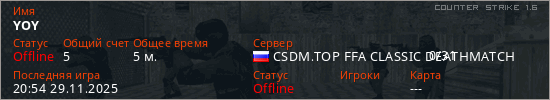Играет на Counter Strike 1.6 сервере. Страна: РоссияПервый раз замечен 20:50 29.11.2025