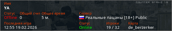 Играет на Counter Strike 1.6 сервере. Страна: РоссияПервый раз замечен 12:53 19.02.2026