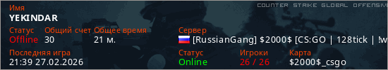 Играет на Counter Strike Global Offensive сервере. Страна: РоссияПервый раз замечен 11:30 22.02.2026