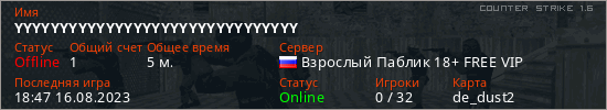 Играет на Counter Strike 1.6 сервере. Страна: РоссияПервый раз замечен 18:36 16.08.2023