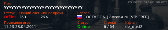 Играет на Counter Strike Source сервере. Страна: РоссияПервый раз замечен 13:25 16.02.2020
