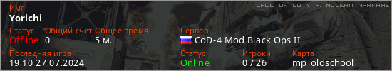 Играет на Call of Duty 4: Modern Warfare сервере. Страна: РоссияПервый раз замечен 19:06 27.07.2024