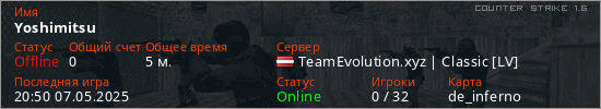 Играет на Counter Strike 1.6 сервере. Страна: ЛатвияПервый раз замечен 20:44 07.05.2025