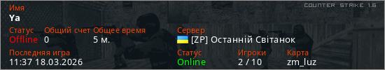 Играет на Counter Strike 1.6 сервере. Страна: УкраинаПервый раз замечен 11:34 18.03.2026