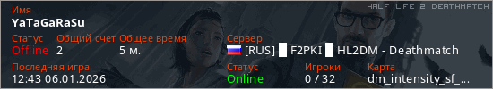 Играет на Half Life 2 DeathMatch сервере. Страна: РоссияПервый раз замечен 11:57 06.01.2026