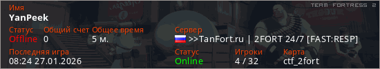 Играет на Team Fortress 2 сервере. Страна: РоссияПервый раз замечен 08:14 27.01.2026