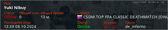 Играет на Counter Strike 1.6 сервере. Страна: РоссияПервый раз замечен 13:24 12.08.2024