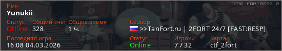 Играет на Team Fortress 2 сервере. Страна: РоссияПервый раз замечен 17:53 15.02.2026